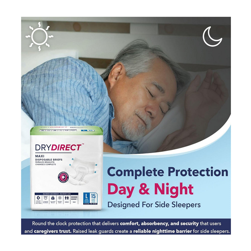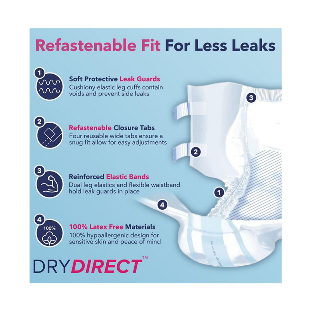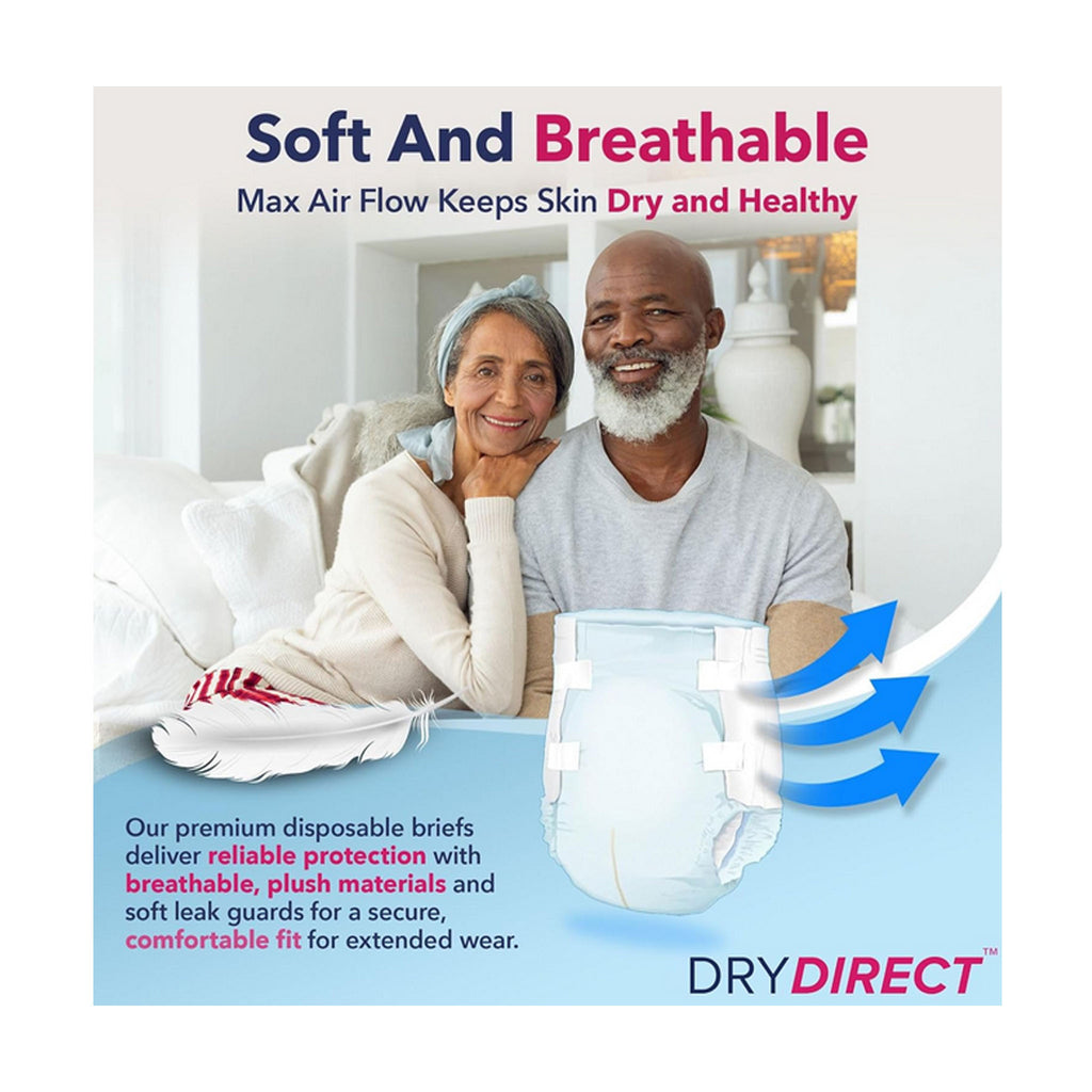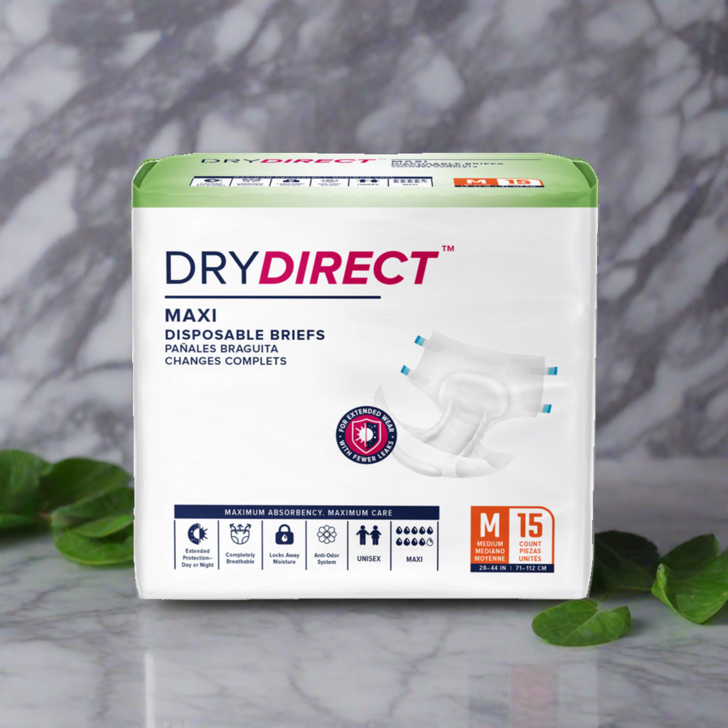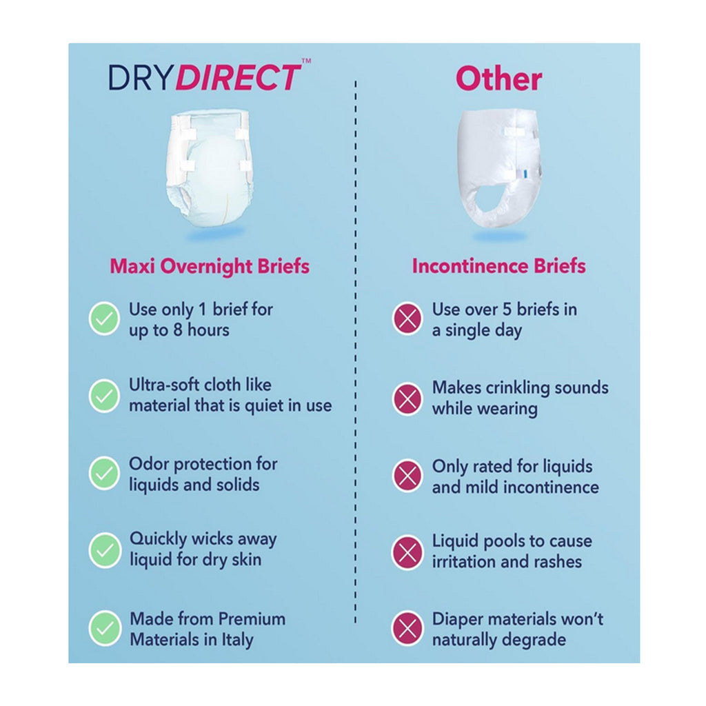 Dry Direct Maxi Briefs is our finest tape-on brief for heavy absorbency / overnight brief. Our Maxi Briefs hold over 5 cups of void (multiple voids) locked away from sensitive skin – for extended wear of 8 hrs plus. Our Maxi briefs are noticeably softer and more comfortable than others in the marketplace – with a luxurious top sheet and side panels– all 100% made in Italy.