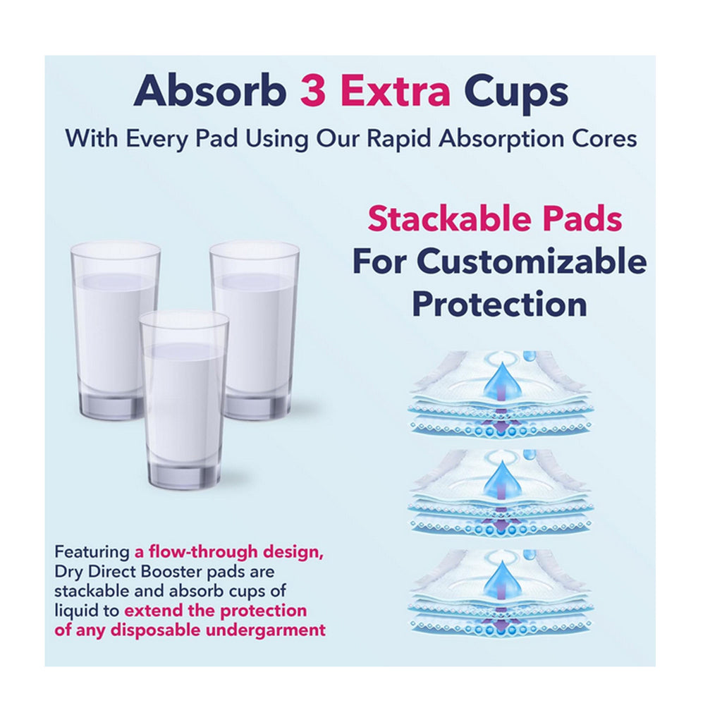 Dry Direct Booster Pads are designed to enhance absorbency when used with disposable briefs or pull-ons by adding up to 3 cups of additional capacity. Booster pads are ideal to improve the performance of daytime or value incontinence products, or to troubleshoot leakage issues (especially males or side sleepers). These booster pads, when paired with Dry Direct Underwear or briefs, will eliminate all but the most stubborn of leaks. Dimensions: 4.25" x 15". Ideal for overnight use, travel, or periods of increased output. Supports longer wear time, reduces garment changes, and improves dryness and comfort.